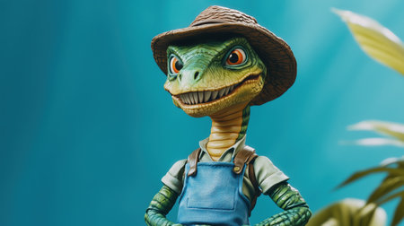 A friendly, humanized dinosaur stands confidently in a blue kitchen apron and a farmer hat, radiating warmth and good vibes with a cheerful smile against a bright blue background.