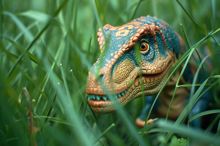 Dinosaur in the green grass. Selective focus on dinosaur.
