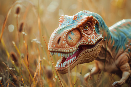 This close-up shot features a toy dinosaur with its mouth wide open, revealing intricate details of its teeth and tongue. The plastic texture of the dinosaurs skin adds to the realism of the miniature creature.