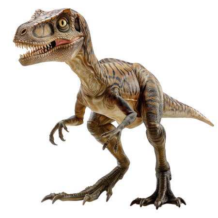 Close up of velociraptor dinosaur toy isolated on white background.