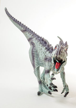 Plastic dilophosaurus dinosaur toy roaring, isolated on white background