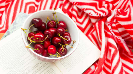 The book and red ripe cherries. Two ripe cherries look out of the book. Cherries as an unusual bookmark for the book. Notebook for Recipes and Cherries.the concept of summer vacation and relax.