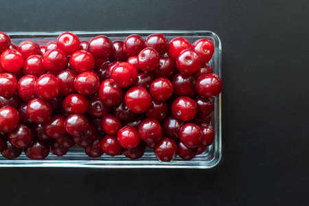 Fresh ripe cherry on the black background. Top view, copy space. Harvesting red cherries in season.
