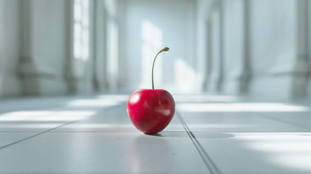 Cherry on the floor in the white room, shallow depth of field