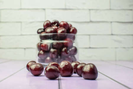 Ripe fresh cherries in glassware on the background of a light brick wall. The concept of healthy food, diet. Blurred background. Focus on the foreground. Side view. Selective focus.