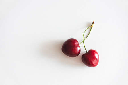Close-up fresh red cherry of heart shape on white table. Top view