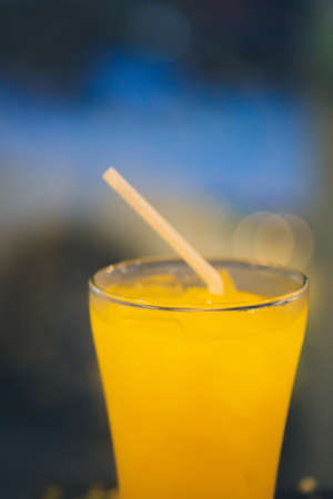 Pouring orange juice into a glass, on a blue background. Glass of orange juice on a colorful table in bright light.