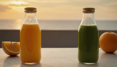 AI Generated. Refreshing Glass Bottle Filled with Bright Orange Juice Surrounded by Natural Background