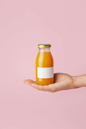 Female hand with bottle of juice on color background