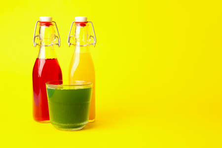Different healthy juice on color background