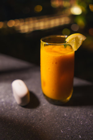 Glass of fresh mango juice with a lime wedge on a dark bar counter, moody lighting, with bokeh background in the dark night