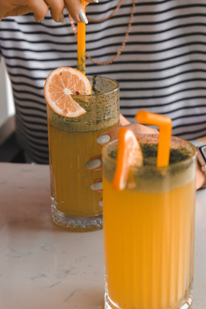 Woman holding a glass of fresh orange juice and a straw in a cafe
