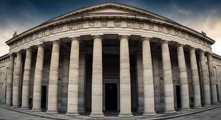 A striking view of classical architecture showcases tall columns under a dramatic sky, representing stability, strength, and historical significance in urban landscapes.
