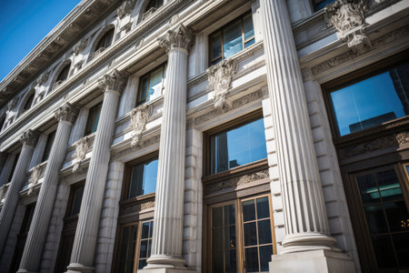 A panoramic view of bank exterior, showcasing its columns and architecture, symbolizing trust and reliability financial services