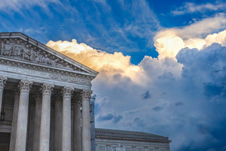 Front view of the iconic building of United States Supreme Court at day time, Washington DC, USA. The concept of judicial branch of American political system