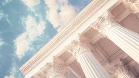 Majestic classical columns rise against a bright blue sky showcasing intricate designs and historical architecture in full sunlight.