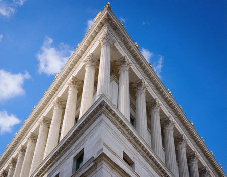A grand building with detailed columns standing beneath a clear blue sky, Incorporate intricate details such as friezes, pediments, and pilasters into a neoclassical structure