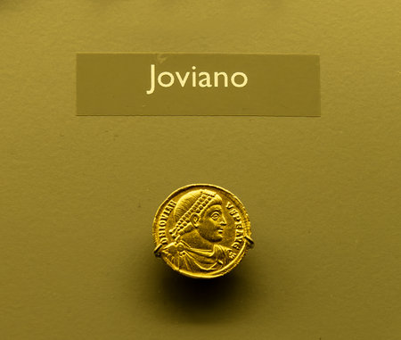 A detailed gold coin from the Roman Empire showing Emperor Jovian, displayed at the Merida Museum. Highlights the artistry and historical value of ancient Roman coinage.
