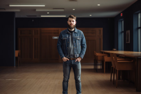 Portrait of a handsome young man in jeans jacket standing in office