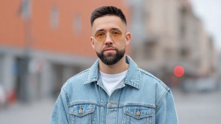 A stylish young man with a beard and sunglasses stands confidently outdoors in a denim jacket, capturing the essence of modern urban life and fashion trends.