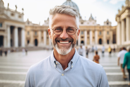 Portrait of a smiling mature man wearing eyeglasses in front of St. Peter's Basilica in Vatican City