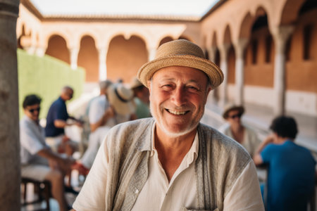 Handsome senior man with hat sitting at table in morocco