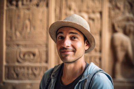 Handsome young man with hat looking at camera in Egyptian temple