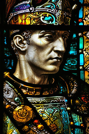 Imperial king or saint figure with a golden halo and ornate crown in mosaic art