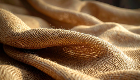 Soft burlap fabric showcases its warm earthy tones and intricate texture perfect for crafts and home decor.