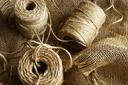 Close up of hank of twine, reel of rope, ball of hemp thread on jute background