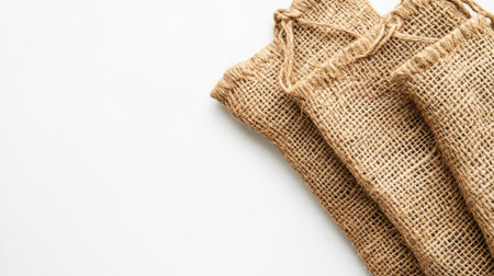 Top view of eco-friendly jute bags, clean white background, no people, copy space