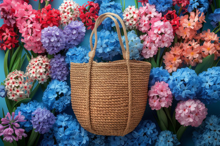 Beautiful straw bag with seasonal purple flowers of hyacinth and carnation blossom. Generative AI