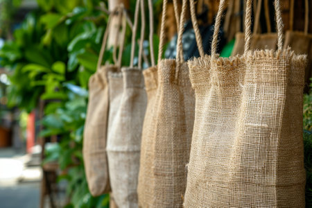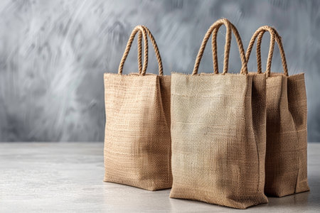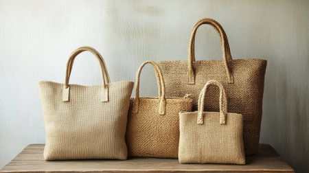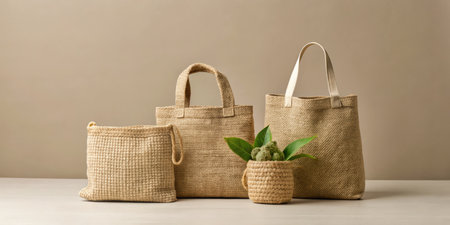 Eco-friendly handbags made from jute and canvas with natural textures on a rustic wooden table