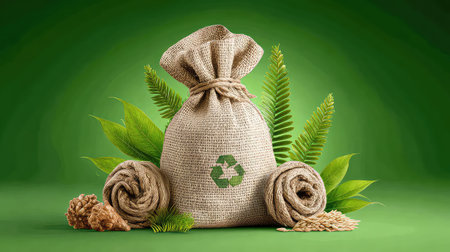 This image showcases an eco-friendly burlap bag featuring a recycling logo, beautifully surrounded by fresh green leaves and natural elements, symbolizing sustainability.