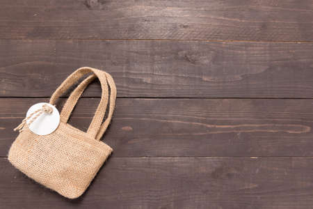 Hessian sack bag is on the wooden background with tag.