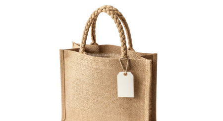 A close-up shot of a durable, eco-friendly jute tote bag featuring sturdy rope handles. A blank hang tag is attached, perfect for personalization or branding. Ideal for shopping, groceries, or gifts.