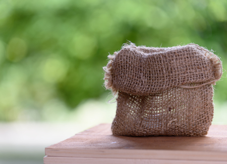 Sackcloth bag on wood table top with nature green blurred backgroun,space for products