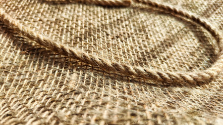 Burlap fabric, coarse jute weave and thick burlap rope. Background, texture, pattern, and frame.