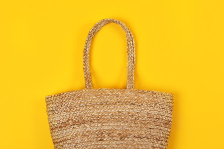 Stylish woman's straw bag on yellow background, top view