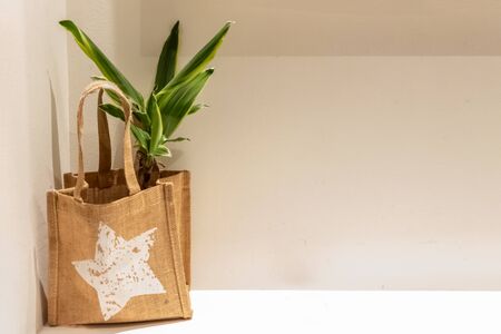 Reusable canvas tote bag standing by window with plants in background