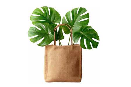 Fresh green monstera plant with large split leaves placed inside a natural woven jute bag, combining indoor greenery with eco-friendly decor.