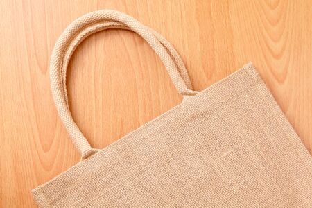 Burlap bag with handles on wood surface