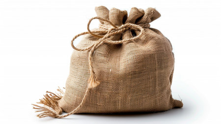 This image features a close-up of a tied jute sack made from natural fibers, showcasing its textured fabric and rustic charm against a bright background.
