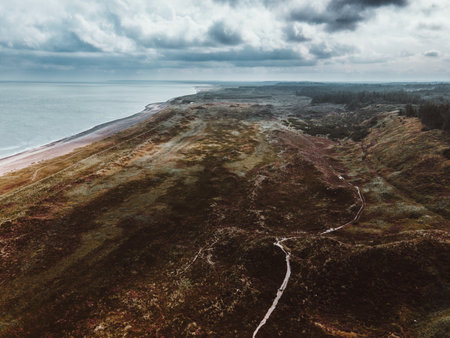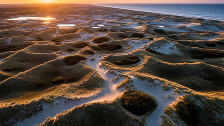 Aerial view of sand dunes at sunset, Baltic sea.