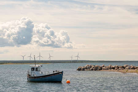 Fishing Boat by Wind Power Stations and a partly cloudy sky.