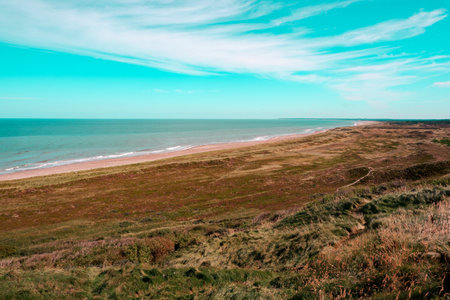 Hilly coast of the northern sea. Sun, blue sky, clouds, waves and grass. Beautiful landscape summer on the northern sea. Danish Coastal Landscape