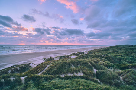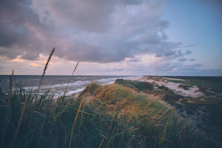 Baltic sea coast (sand dunes) after the storm at sunset. Clear sky, glowing clouds, wind. Autumn landscape. Nature, environmental conservation, ecology, ecotourism, local travel