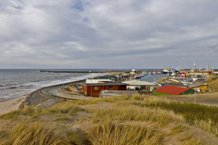 coastline in north Denmark with houses, grass and cloudy sky
