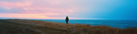 A house on a dune overlooking the ocean under a cloudy sky. The composition features a house structure atop a sandy dune with weathered grass in the foreground. The sky is partly cloudy, offering a panoramic view of the beach and ocean. Suitable for commercial and editorial purposes this image depicts tranquility and solitude.
