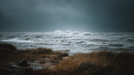 A captivating view of a dark and stormy sea, featuring high waves and ominous clouds. This atmospheric scene captures the raw power of nature's elements along the coastal shoreline.